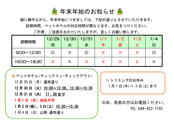 PDF版はこちら 武蔵小杉、元住吉で犬ネコうさぎのことなら元住吉からき動物病院元住吉からき動物病院。犬ネコうさぎハムスターなどの一般的な診療から健康診断・去勢手術など、安心の料金設定で幅広く対応。土日診療、往診、駐車場完備。川崎市中原区、武蔵小杉で動物病院・ペットホテル・トリミングをお探しならお気軽にご相談ください。 元住吉からき動物病院 〒211-0032 神奈川県川崎市中原区木月伊勢町4-17 TEL:044-422-7155URL:anisumi-vet.jp 共有:FacebookXいいね:いいね 読み込み中…